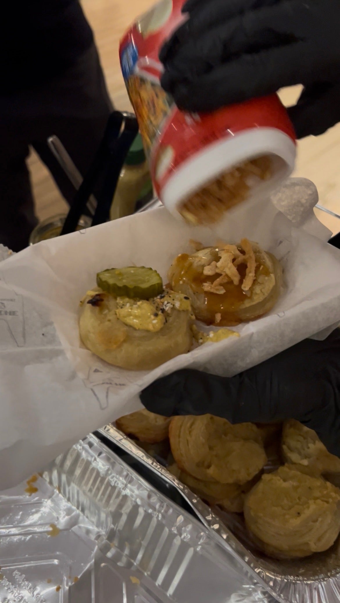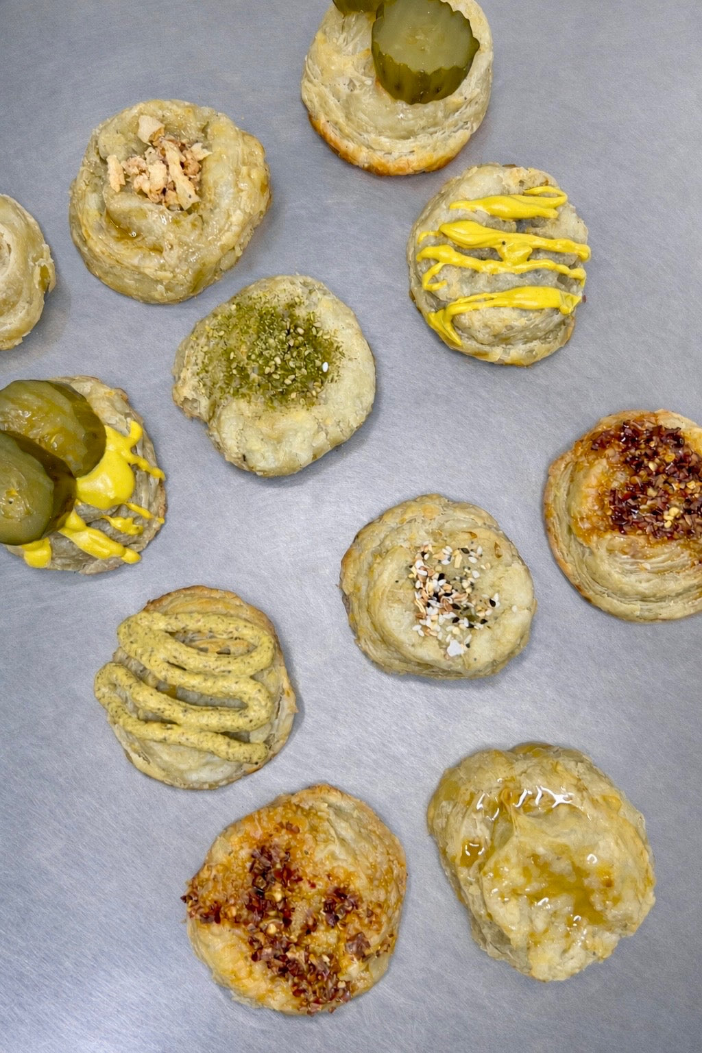 We currently serve one signature knish, and we do it very well. A flaky, cocktail sized potato knish filled with garlic and caramelized onions. Classic, comforting, and designed to be dressed up with toppings or eaten straight from the tray.